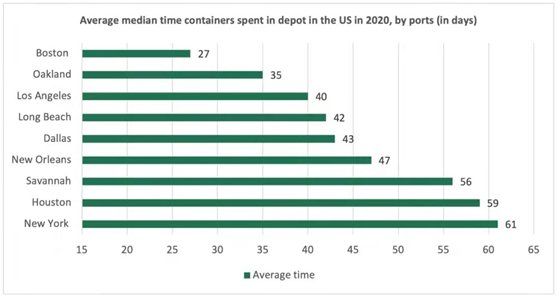 在美國(guó),各港口的表現(xiàn)差異很大。雖然集裝箱在美國(guó)的平均停留時(shí)間從2020年的66天下降到去年的50天,但在紐約港的平均停留時(shí)間為61天,其次是休斯頓港(59天)。洛杉港和長(zhǎng)灘港的記錄為40-42天。