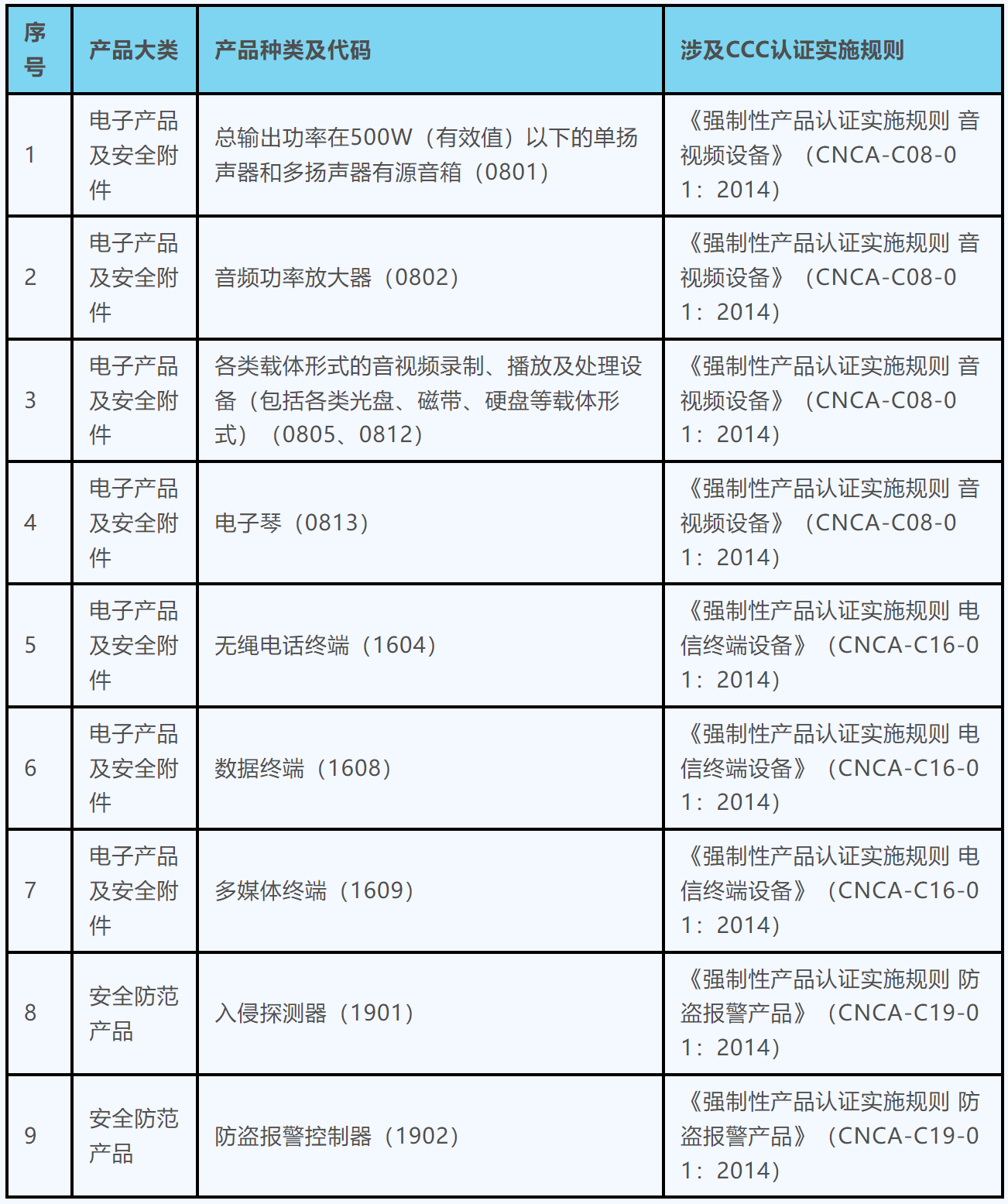 二、《強(qiáng)制性產(chǎn)品認(rèn)證實(shí)施規(guī)則 音視頻設(shè)備》(CNCA-C08-01:2014)和《強(qiáng)制性產(chǎn)品認(rèn)證實(shí)施規(guī)則 電信終端設(shè)備》(CNCA-C16-01:2014)適用范圍刪除相關(guān)產(chǎn)品;廢止《強(qiáng)制性產(chǎn)品認(rèn)證實(shí)施規(guī)則 防盜報(bào)警產(chǎn)品》(CNCA-C19-01:2014)。