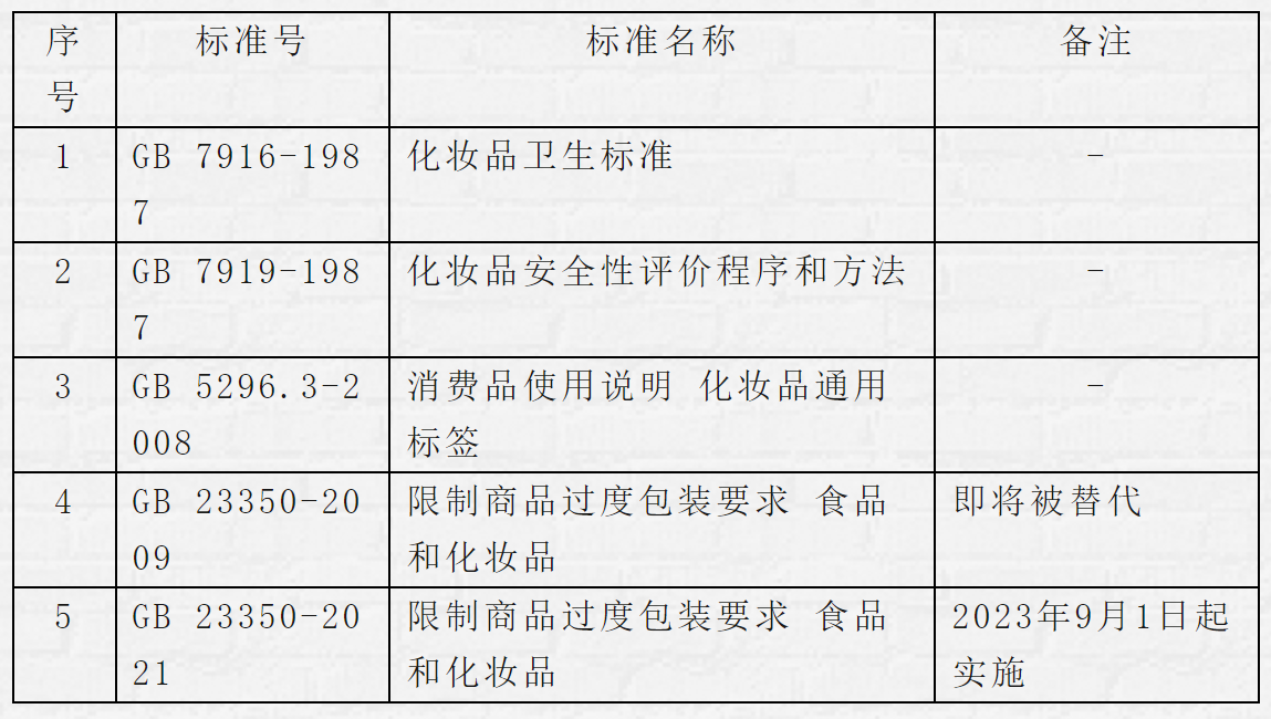 進口化妝品應符合 《化妝品安全技術規(guī)范》(2015版) ( Safety and Technical Standards for Cosmet-ics)和強制性國家標準的要求。化妝品主要的產(chǎn)品標準如下表所示(使用時應注意相關標準是否已有更新版本)。